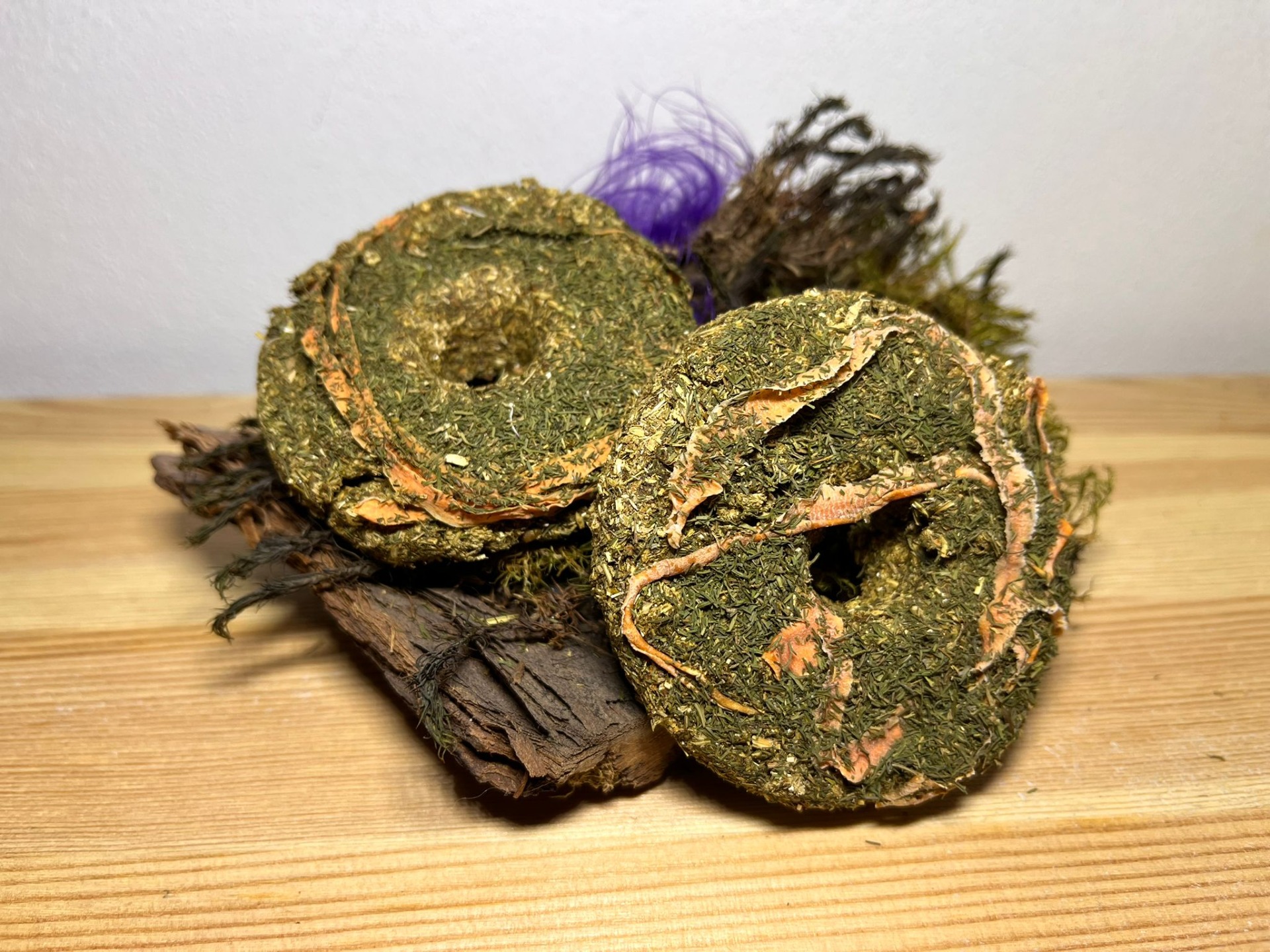 Ručně vyráběný pamlsek pro hlodavce. Neobsahuje žádné konzervanty, složení je bez obilné.Složení: bezobilné granule pro morčata, seno, lněné semínko, mrkev, kopr.Váha: 17 g.