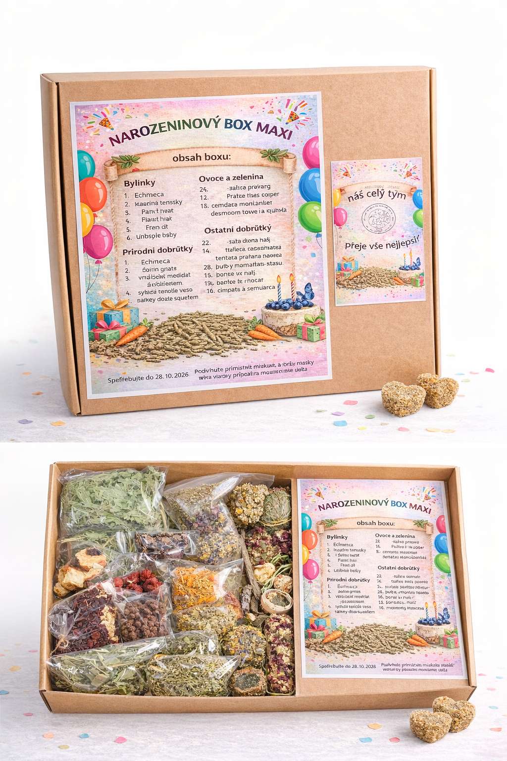 Narozeninový box je plný zdravých věcí pro mlsná morčátka. Obsahuje: březovou kůru, zelený oves, sušenou zeleninu (mrkev, celer, petržel, červená řepa), rybízové listy, senová koule se zeleninou, extrudované lněné semínko, echinacea, měsíček lékařský, ibišek květ, chrpa, bazalka, vojtěškové seno, sušené jahody, sušené hrušky, kořen pampelišky, jitrocelové listy, kukuřičné listy, svatojánský chleba, pamlsky - tyčka kořenem pampelišky, kopřivák, řepová srdíčka, mrkvička, jahůdka, kostičky se sedmikráskou, tyčinky s řapíkatým celerem, kolečka s růží, kolečka s koprem, kytička s jablky, chrpáče Dárek od nás - borůvkový dortík. Váha: cca 1300 gramů