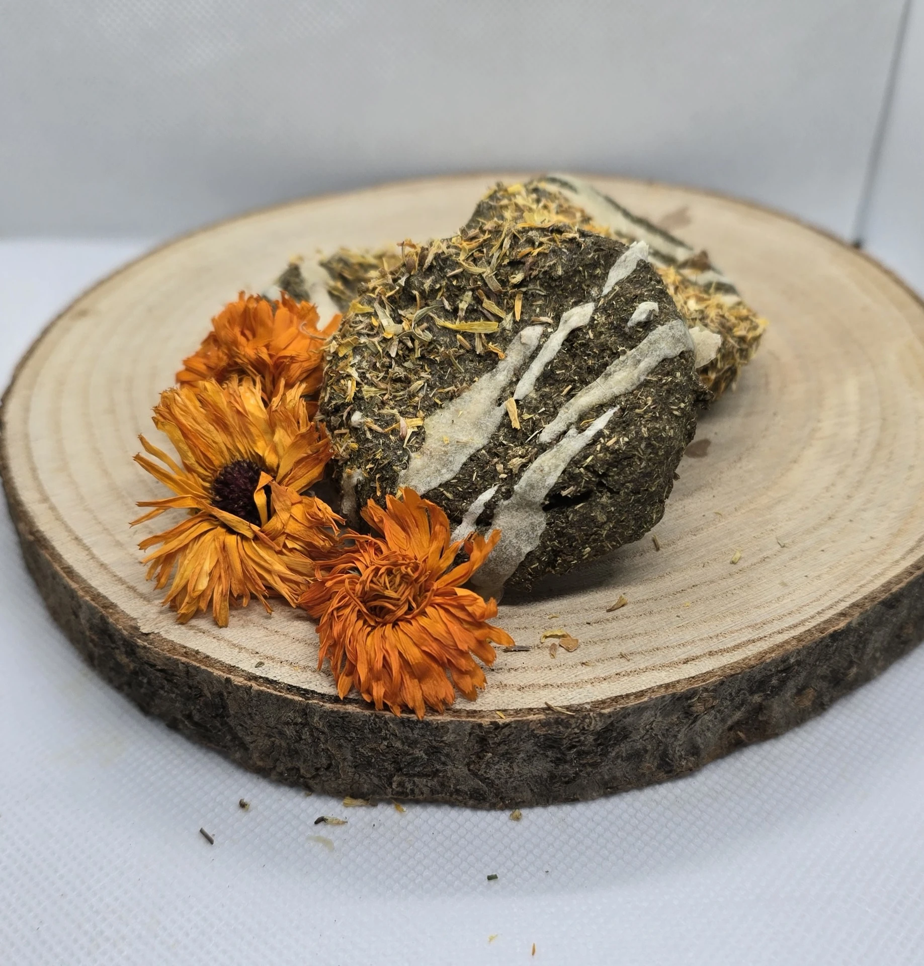 Bezobilná sušenka s domácím měsíčkem lékařským.Cena za 1 kus.Vhodné především pro: morčata, králíky a činčilyVhodné také pro: křečky, křečíky, osmáky, potkany, pískomily.Měsíček působí antisepticky a výrazně hojivě. Detoxikuje organizmus. Používá se také při dýchacích problémech, při zánětech močových cest, a blahodárně působí také na žaludek.