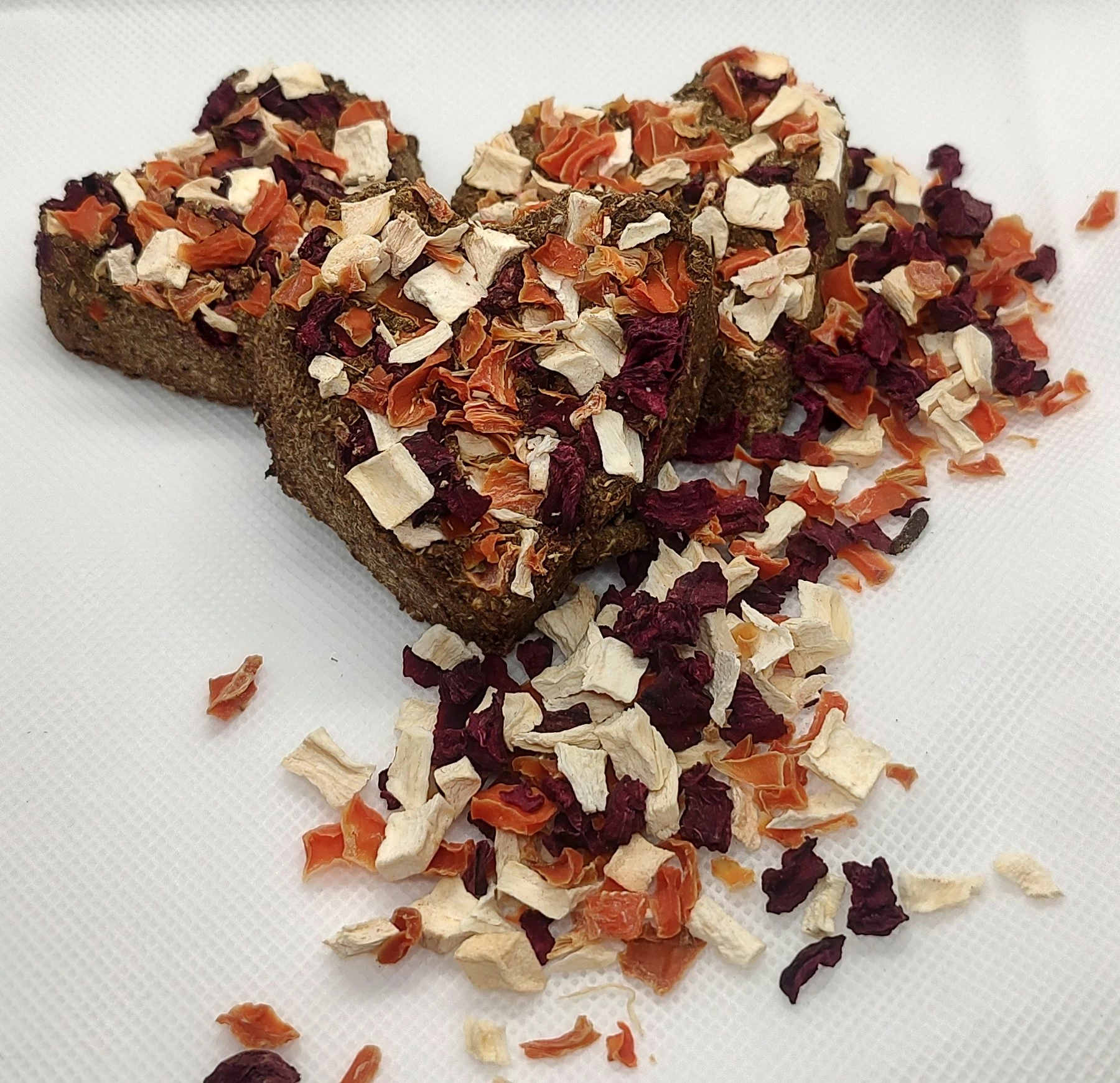 Bezobilná sušenka s domácí sušenou zeleninou – petržel, řepa a mrkev.Cena za 1 kus.Vhodné především pro: morčata, králíky a činčilyVhodné také pro: křečky, křečíky, osmáky, potkany, pískomily.