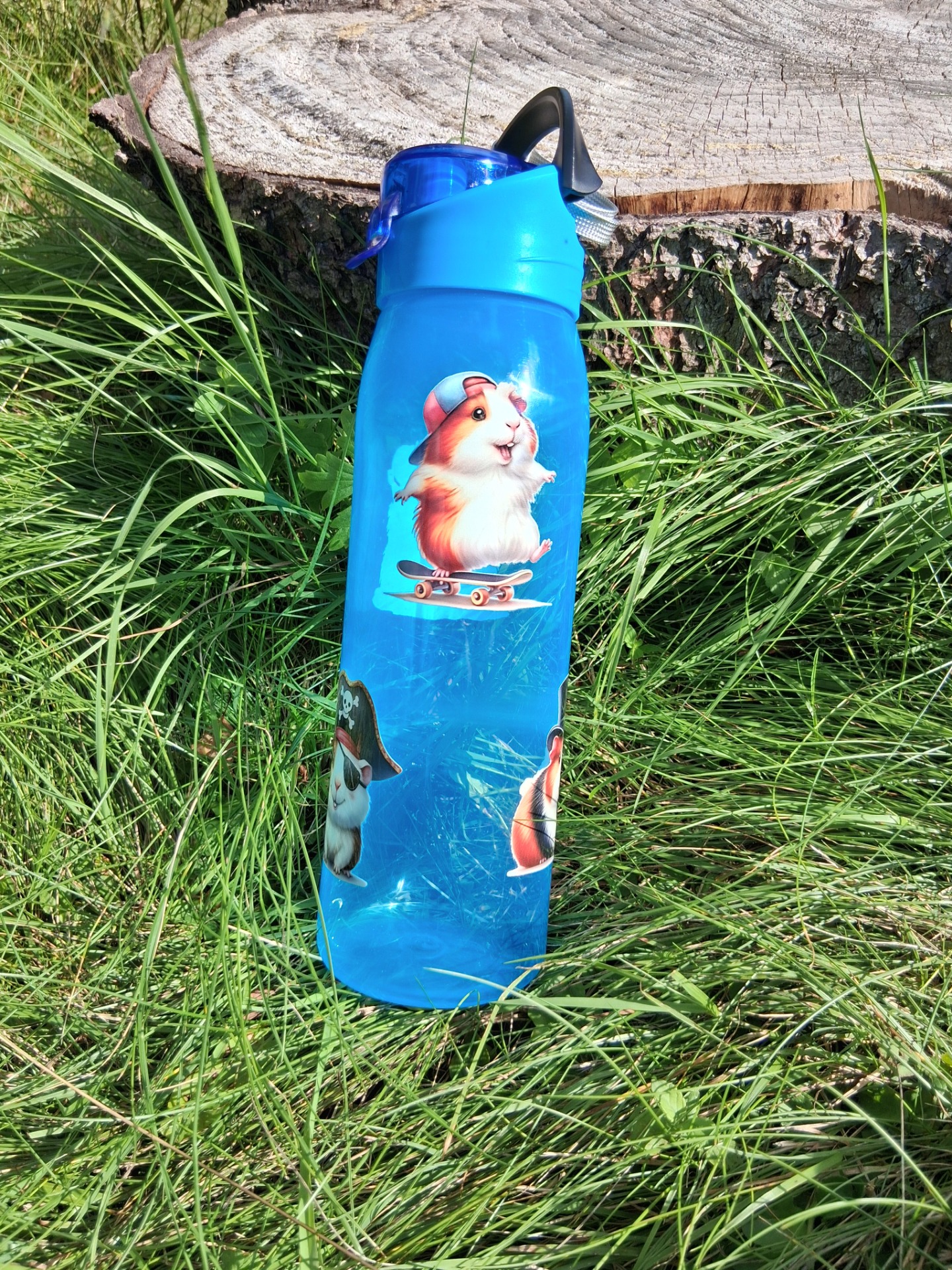 Plastová láhev na pití s vtipnými obrázky morčátek. Poutko na držení. Každá kus ma trošku jiné obrázky. Nedávat do mikrovlnné trouby, do myčky na nádobí.  Neplnit horkými nápoji.  Vyrobeno v Číně.